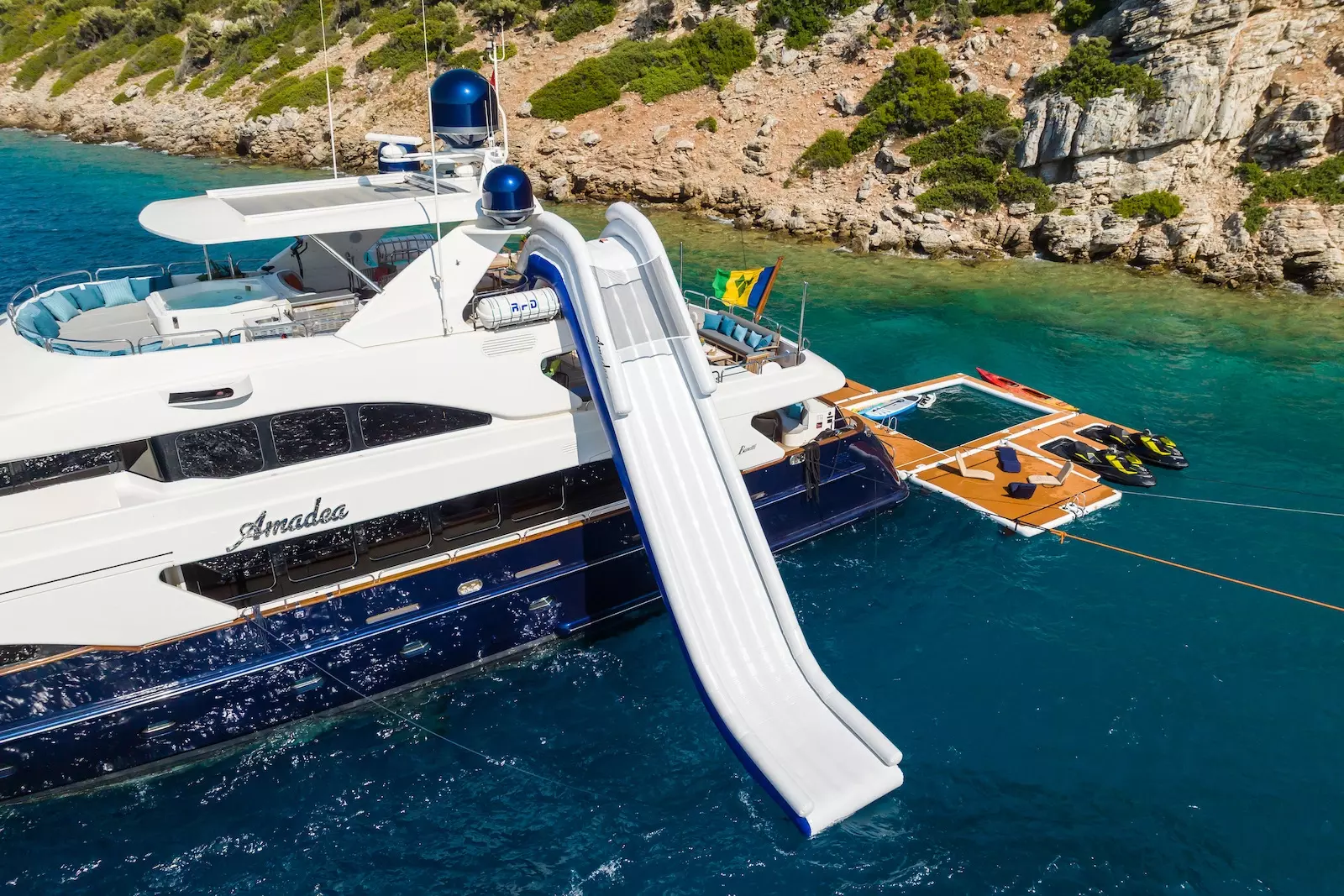 Our yacht, Amadea provides a variety of amenities and entertainment options to elevate your yachting getaway or sailing trip. With a selection of water toys on board, including 2 Seadoo Jet Ski – Amadea promises enjoyment and excitement for everyone. Whether you fancy jet skiing for thrills kayaking along the coastlines or diving into the crystal waters.