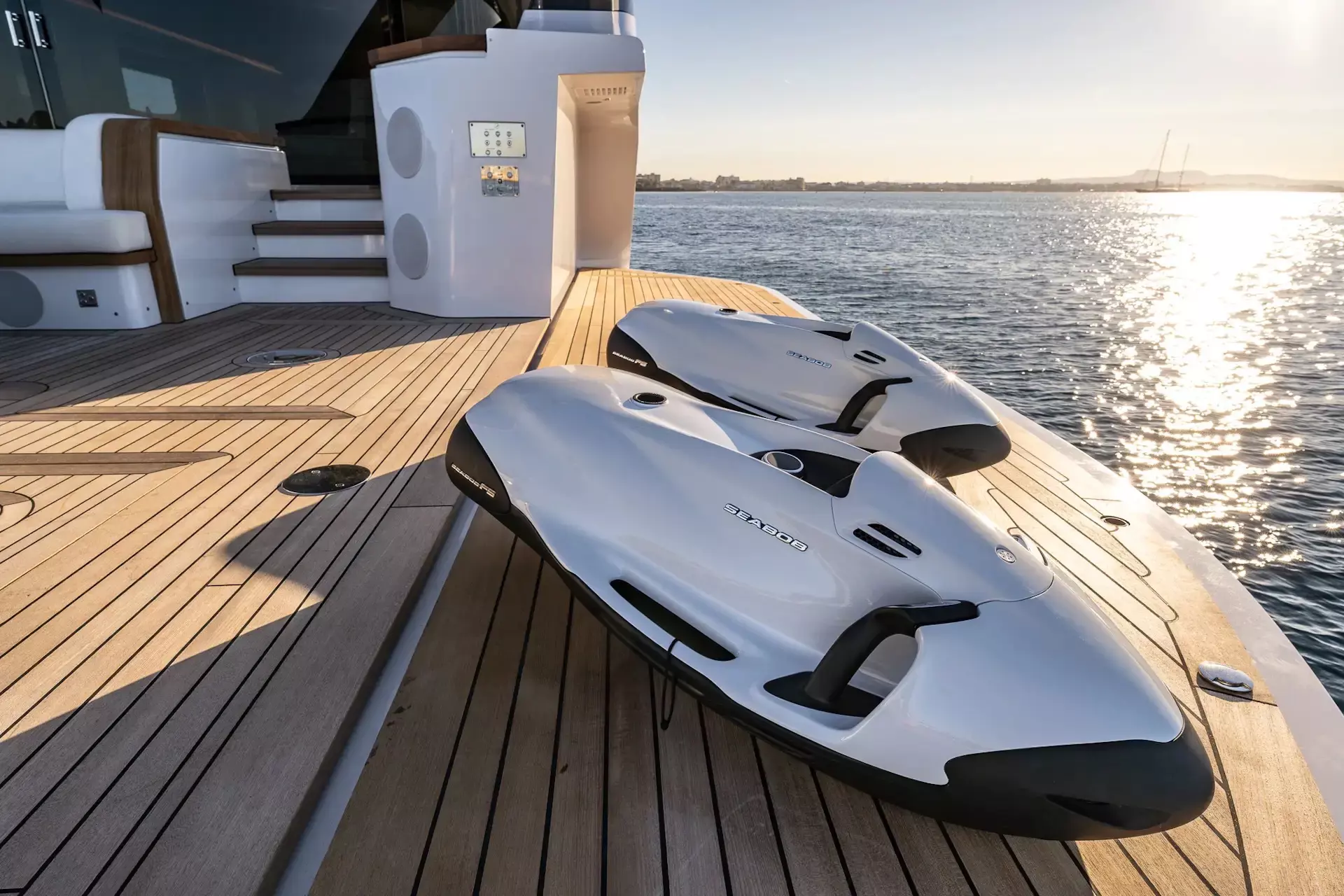 The yacht, known as Alpha Waves enhances the sailing experience by offering a variety of luxuries and entertainment options. Picture yourself on this designed vessel, equipped with cutting edge technology and innovative features. Alpha Waves comes with a range of water toys, including 2 Seabobs, ensuring fun and excitement during your multi day yacht trip.