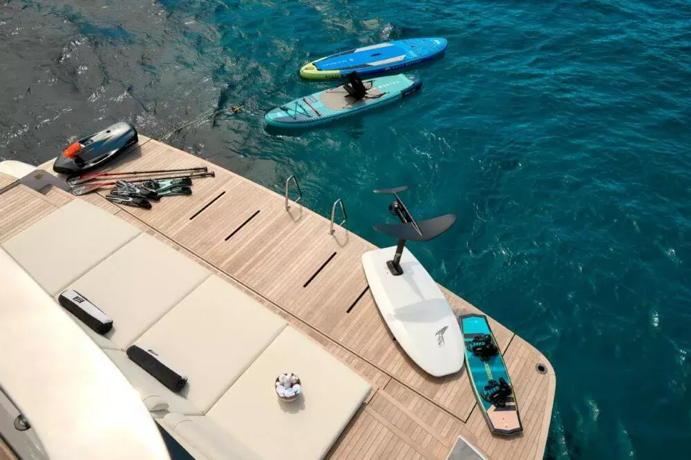 The yacht, known as B.A.13 enhances the sailing experience by offering a variety of luxuries and entertainment options. Picture yourself on this designed vessel, equipped with cutting edge technology and innovative features. B.A.13 comes with a range of water toys, including Seadoo Jet Ski, Seabob, and E-foil, ensuring fun and excitement during your multi day yacht trip.