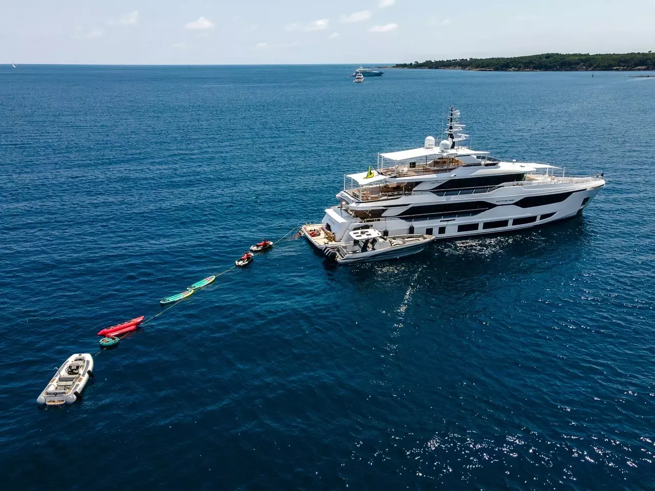 The yacht, known as Optimism enhances the sailing experience by offering a variety of luxuries and entertainment options. Picture yourself on this designed vessel, equipped with cutting edge technology and innovative features. Optimism comes with a range of water toys, including Two Seadoo Spark, Two Seabob, ensuring fun and excitement during your multi day yacht trip.
