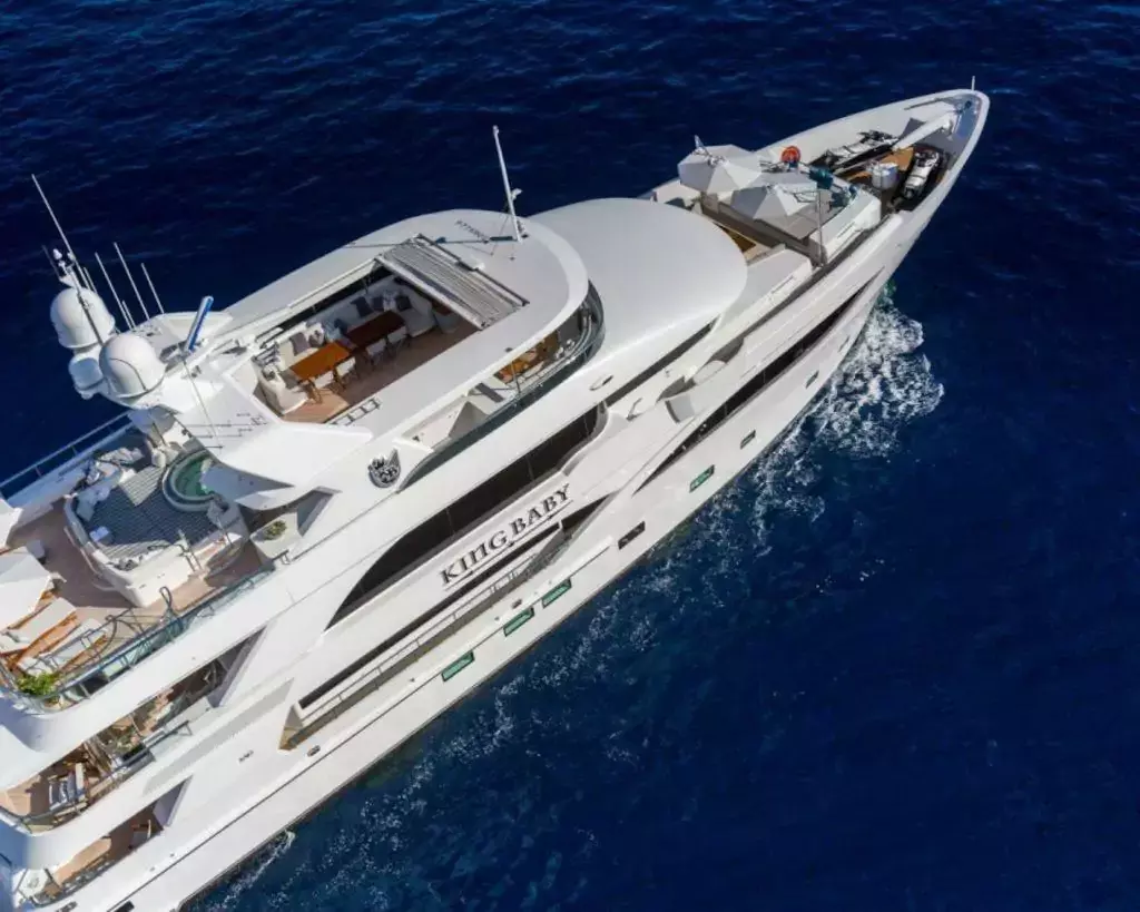 King Baby is a 144 feet superyacht featuring state-of-the-art, cutting edge technology, and the latest modern advances in yacht building. With 5 cabins, it sleeps 10 guests and accommodates up to 12 people on a day charter with a professional crew of 11. Built by a renowned builder, IAG Yachts, the superyacht King Baby was launched in 2016 complete with ultramodern technology and innovative features.