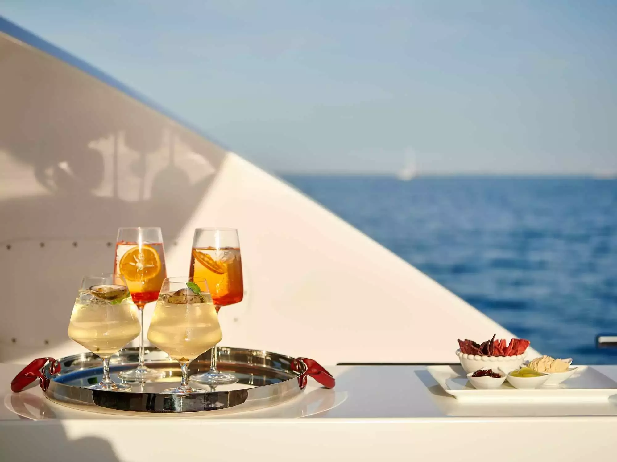 While on board bask in the sun on the decks relax in the jacuzzi. Catch a movie in the yachts private cinema. Fitness enthusiasts can stick to their workout routines in the cutting edge gym facility. Food enthusiasts will be treated to dishes prepared by our onboard chef; from snacks to elaborate multi course meals.