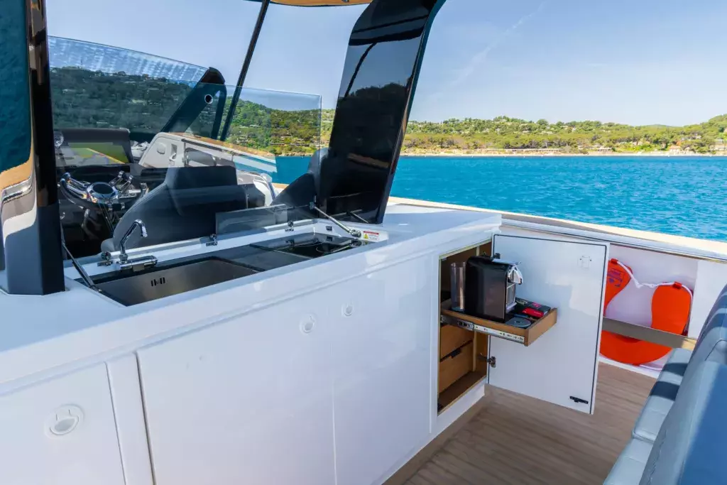 Designed and built with love by Pardo, the luxury motor yacht King Mouss was launched in 2021 complete with ultramodern technology and innovative features, delivering a yacht holiday with an extraordinary comfort. King Mouss spans 43 feet of luxurious living space and playground above water. With 2 cabins that sleep 4 guests and accommodating up to 11 people on a day charter with a professional crew of 2, King Mouss will exceed your expectations.