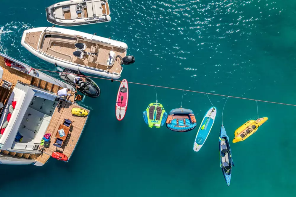 The yacht, known as No Stress enhances the sailing experience by offering a variety of luxuries and entertainment options. Picture yourself on this designed vessel, equipped with cutting edge technology and innovative features. No Stress comes with a range of water toys, including Jet Ski and 2 Seabobs, ensuring fun and excitement during your multi day yacht trip.