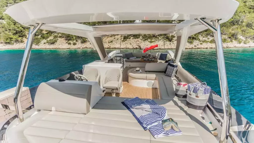 Hunky Dory Of is a grand motor yacht built in 2018 by Sunseeker and having a length of 69 feet. Hunky Dory Of features 4 cabins and capable of carrying 8, or takes up to 12 guests for a day trip with a friendly crew of 2. Packed with features that make an unforgettable yacht charter in Mediterranean, Hunky Dory Of offers you tailor-made yacht holidays you’ll never forget.
